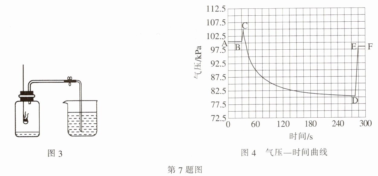 (5)某化学兴趣小组欲混制“富氧空气”并开展相关探究。其中一个探究实验是测定“富氧空气”中氧气的体积分数,用如图3装置测定“富氧空气”中氧气的体积分数(集气瓶容积为250 mL,底部已加入20 mL水)。烧杯中盛有$V_1$ mL的水,红磷充分燃烧后熄灭,冷却至室温后,打开弹簧夹,待右侧烧杯内液面不再变化,两边液面恰好相平,测出烧杯内水的体积为$V_2$ mL。实验过程中广口瓶内压强变化曲线如图4。