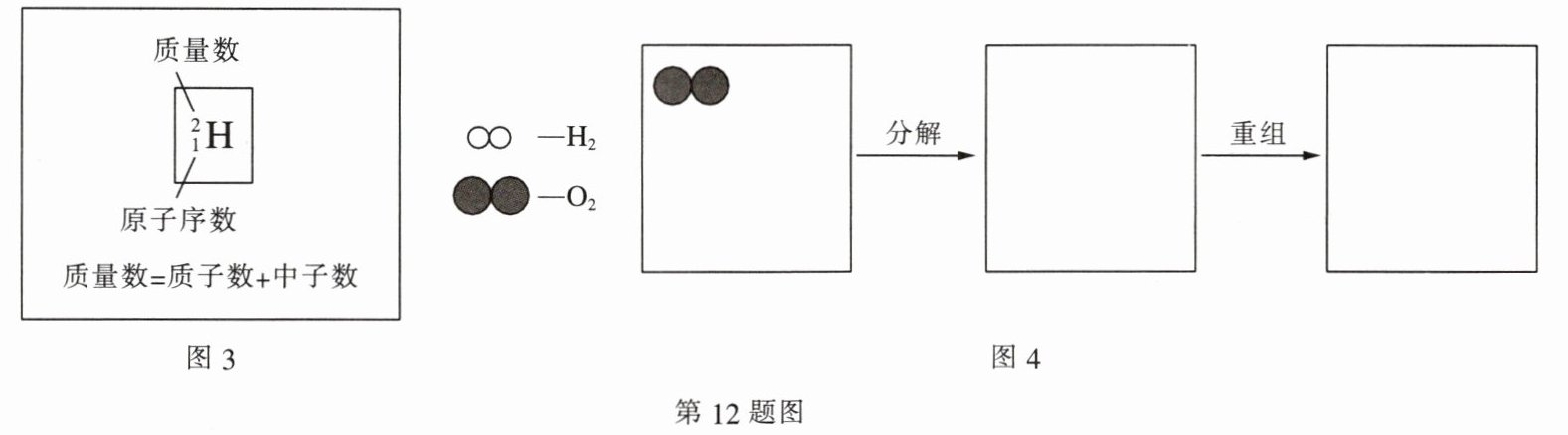 - ② $H_2$ 与 $O_2$ 反应生成 $H_2O$,请在图4所示的小方框中,把 $H_2$ 与 $O_2$ 恰好完全反应的微观过程补画齐全。实验说明,化学变化中的最小粒子是______。