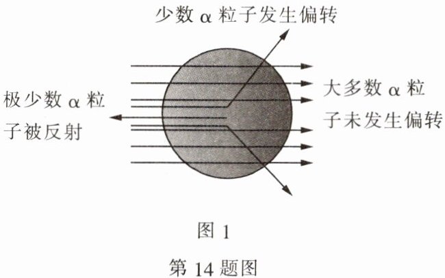 构成的。(3)卢瑟福基于“用带正电的 $\alpha$ 粒子轰击金箔”的实验,提出原子的核式结构模型,该实验不能获得的结论是(