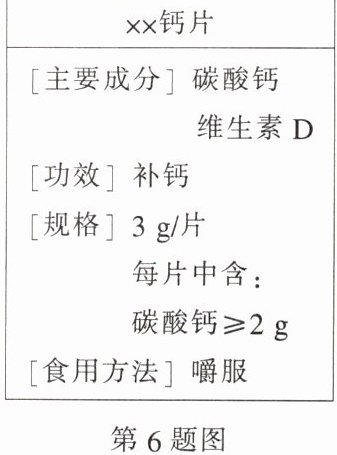 6. 钙是人体必需的常量元素,人体缺钙时可适当服用补钙剂。碳酸钙$(CaCO_3)、$乳酸钙$(C_6H_1₀O_6Ca)$都是补钙剂中常用的含钙物质。