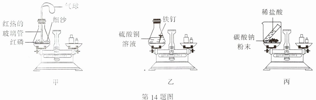 14. 在“质量守恒定律”的学习中,甲、乙、丙三个小组的同学分别做三个实验,依次如图所示,他们都进行了规范的操作、准确的称量。