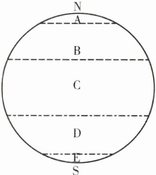 (1)北寒 北温 热 南温 南寒 (2)C B、D A、E (3)北回归线 南极圈 (4)公转 (5)北温带