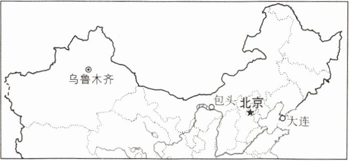 不同城市路灯开关时间不同。为了节约能源,一般情况下,路灯开灯时间在日落前后,关灯时间在日出前后。下图示意大连、北京、包头和乌鲁木齐的地理位置。据此完成8、9题。