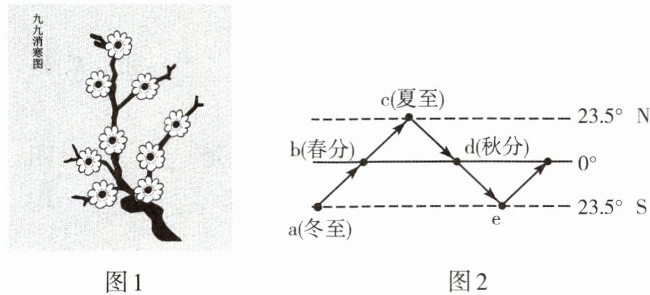 数九是我国古代民间一种计算寒天的方法,从冬至日算起,每九天算“一九”。民间有描画九九消寒图的习俗,人们用墨笔每天晕染一瓣梅花,九九八十一天后,梅花点成,春回大地。图1为九九消寒图,图2为太阳直射点移动路线图。读图完成12、13题。
