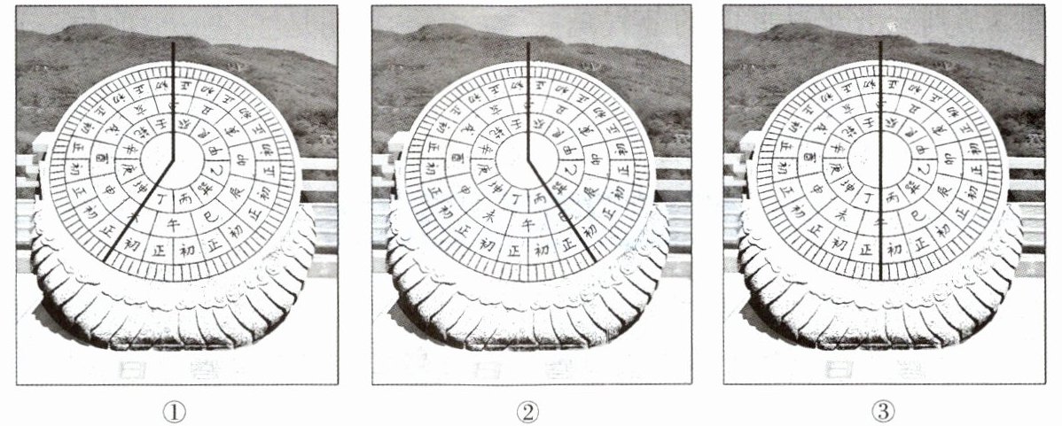 (2024·山东烟台)日晷(guǐ)是古代人类利用日影测定时刻的一种计时仪器,通常由晷针和晷面组成。晷针垂直于晷面,晷针上端指向北极,下端指向南极。读图完成1~3题。