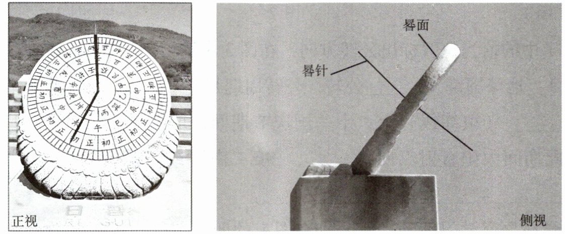 )①一天中太阳位置与晷针影子位置的关系 ②一年中正午太阳高度与晷针影子长度的关系 ③地球自转原理 ④地球公转原理
