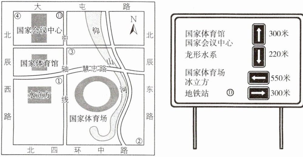 下图为部分北京冬奥场馆分布及指示牌示意图。读图完成9、10题。