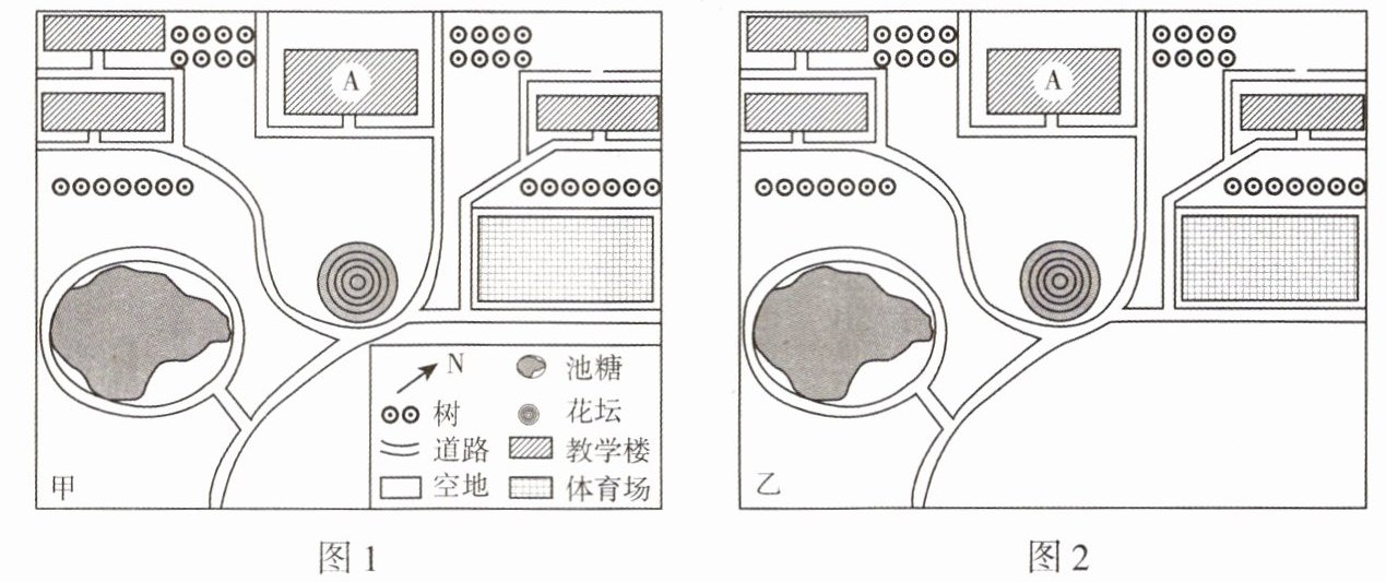 14. 甲和乙两位同学绘制的学校平面图分别如图1、图2所示(两幅图均长6 cm,宽4.8 cm),读图回答下列问题。