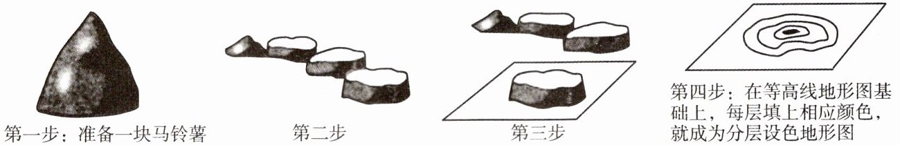 某同学在老师指导下尝试用马铃薯制作等高线地形图和分层设色地形图(活动步骤如下图所示),据此完成10、11题。