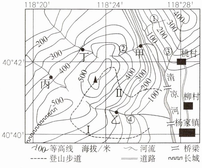 (3)登山路上,小张遇到一个野外考察小组,小组计划考察附近瀑布。瀑布可能位于图中甲、乙、丙、丁四地中的