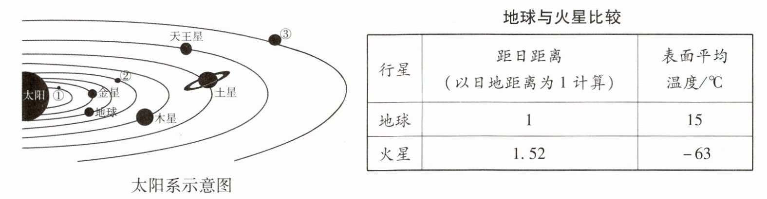 。(3)火星虽然有适合生命存在的物质,但目前仍然没有发现生命存在,由表可知,其原因最可能是