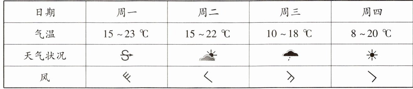 1. 某校计划举行郊游活动,同学们查询了近期天气状况,如下表所示。下列说法正确的是(