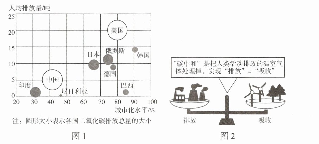中国是负责任的大国,我国提出二氧化碳排放力争2030年前达到峰值,力争2060年前实现碳中和。图1是世界部分国家二氧化碳排放总量和人均排放量图,图2是碳中和示意图。据此完成11~13题。