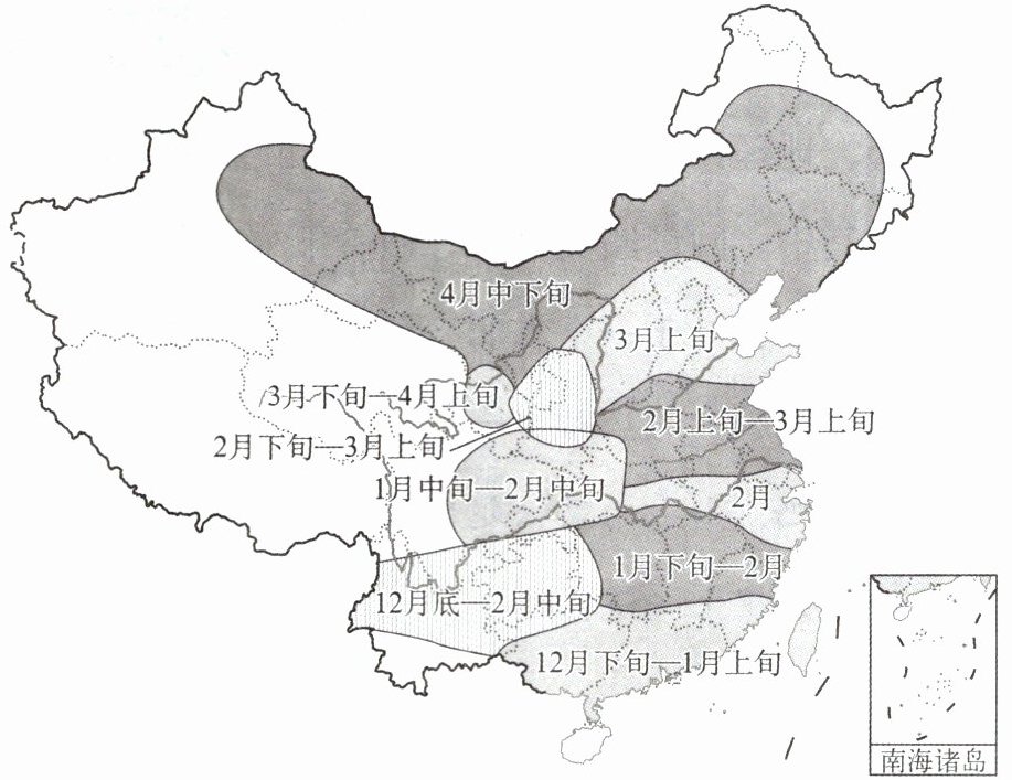 (2024·江苏南通)早春时节,当气温上升到一定条件时,梅便能开花。此时乍暖还寒,偶有降雪天气。梅花凌寒傲雪,象征着坚贞不屈、逆境抗争的精神。下图为中国部分地区梅花最佳观赏期分布示意图。据此完成1~3题。