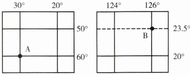 C.B地的经纬度为(23.5°N,126°E)