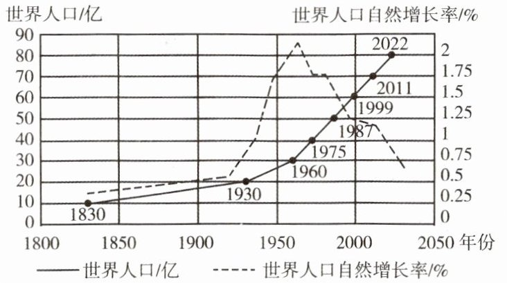 世界人口的增长速度通常用人口自然增长率来表示。人口自然增长率是由人口出生率和人口死亡率决定的。下图为世界人口变化数据统计图。读图完成1、2题。