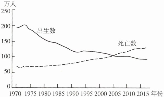 下图示意某国出生人数与死亡人数变化情况。读图完成6、7题。