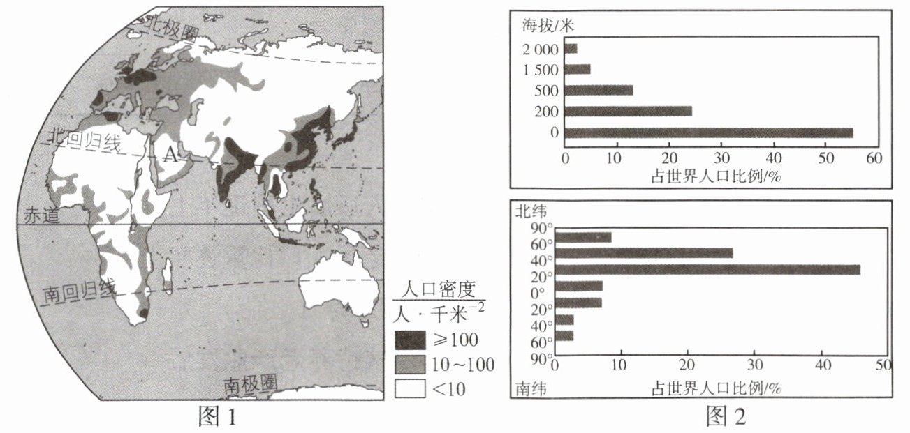 17. 图1为世界局部区域人口密度分布图,图2为不同纬度、海拔人口分布比例图。读图回答下列问题。