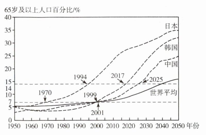 一个国家或地区65岁及以上人口数量占总人口的7%时,标志着该国家或地区进入人口老龄化社会;65岁及以上人口数量占总人口比例的14%时,进入深度老龄化社会。下图为中国、日本、韩国人口老龄化趋势图,读图完成15、16题。
