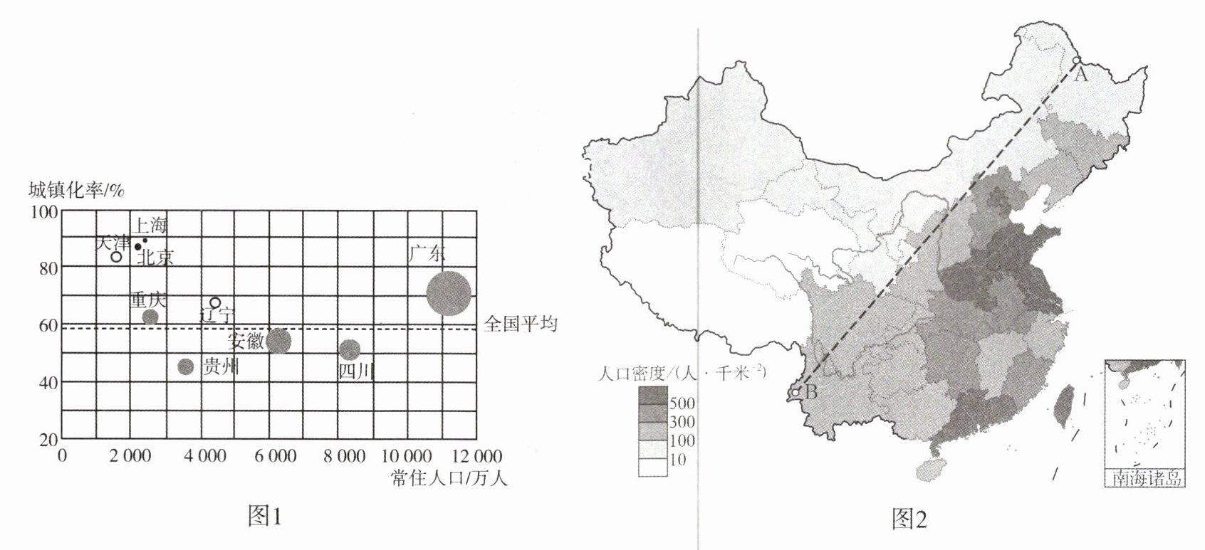 某学校地理兴趣小组为了解我国人口状况,开展了数据分析和社会调查。图1为中国部分省级行政区常住人口、城镇化率(指区域内城镇人口占总人口的百分比)以及近一年的常住人口增减情况示意图(其中实心圆圈表示人口增加,空心圆圈表示人口减少,圆圈大小表示增减的多少)。图2为中国人口密度分布图。