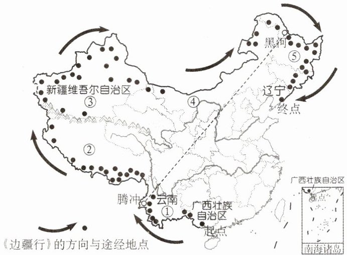 14. 中央电视台《远方的家》栏目推出专题片《边疆行》,以新闻纪实的手法和边行走边观察的方式,顺时针勾绘出一幅从广西到辽宁的美丽画卷,反映我国边疆的风土人情。下图为中国边疆行线路图。读图回答下列问题。