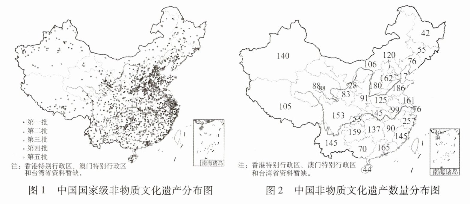 (1)图1所示的中国国家级非物质文化遗产(以下简称“非遗”)分布图与我国人口分布特点大致相似,整体上分布