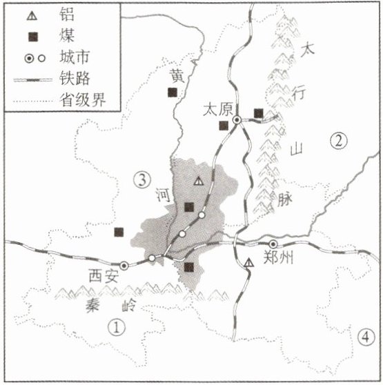 陕、晋、豫三省交界地带,条件优越,经济发展潜力巨大,被称为“黄河金三角”(图中阴影区域)。下图为“黄河金三角”及周边地区示意图。读图完成8、9题。