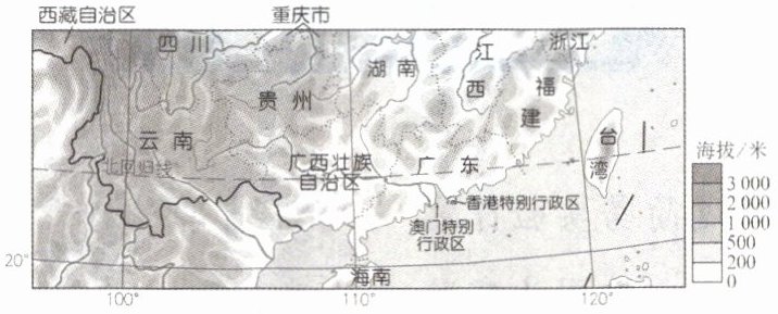 北回归线标志塔是标志地理学上北回归线经过地的建筑物。下图为中国局部区域沿北回归线附近地形图。读图完成16、17题。