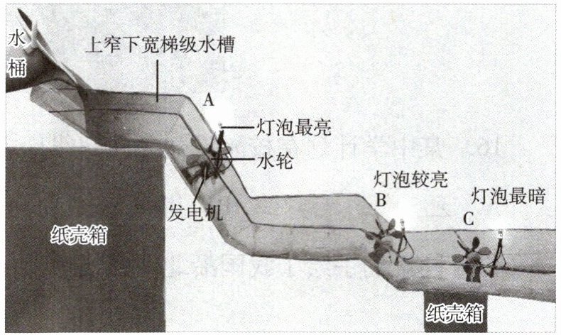 【实验过程】将染色水注入水槽,观察A、B、C三处落差大小、水轮转速和灯泡亮度。