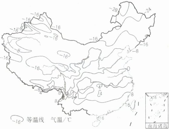 右图为中国1月平均气温分布图,读图完成3、4题。