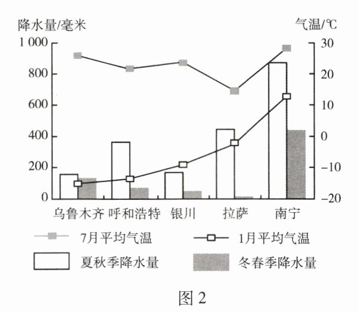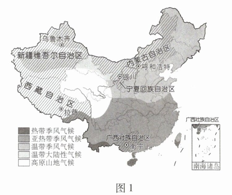 图1为中国5个自治区和气候类型分布示意图,图2为中国5个自治区首府气候资料图。据此完成13~15题。