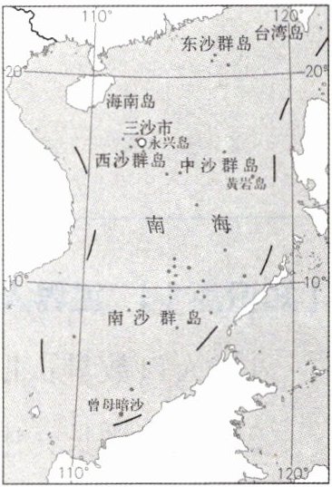 三沙市于2012年6月21日设立,下辖西沙群岛、南沙群岛、中沙群岛的岛礁及其海域。下图为南海诸岛、三沙市位置示意图。读图完成11~13题。