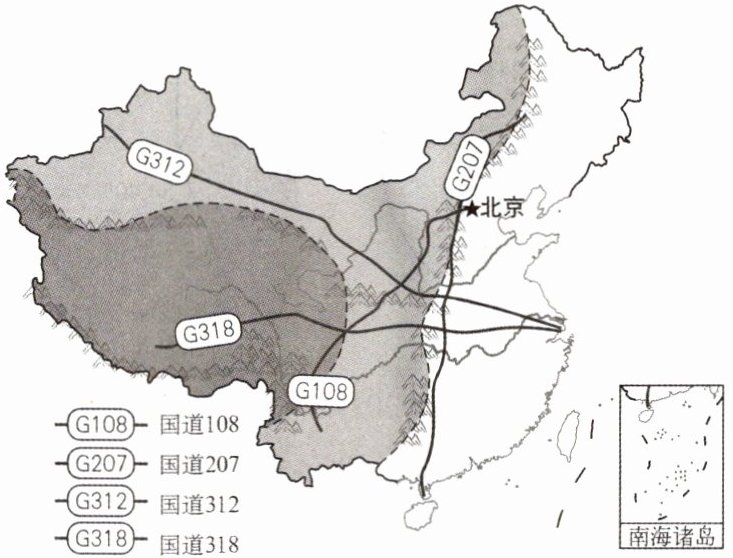 17. 近年来,沿着国道旅行的自驾游十分火热。下图为中国G108、G207、G312、G318四条国道线路图。读图回答下列问题。(7分)
