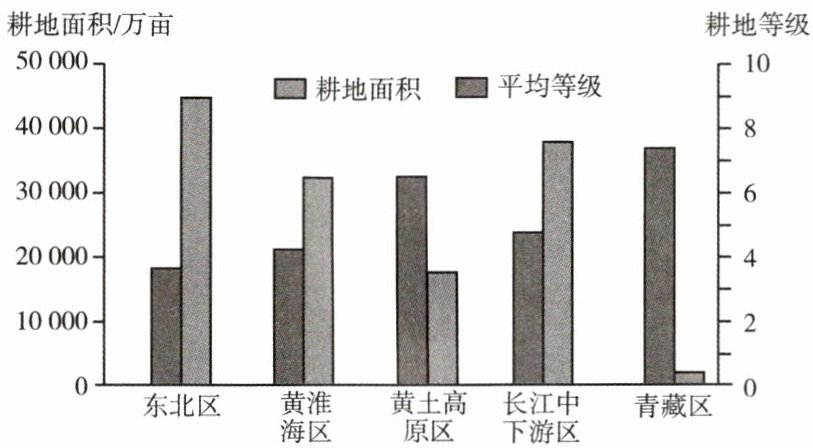 下图为我国部分区域耕地面积及平均等级结构图。耕地等级数值越小,表示耕地质量越优。读图完成11、12题。