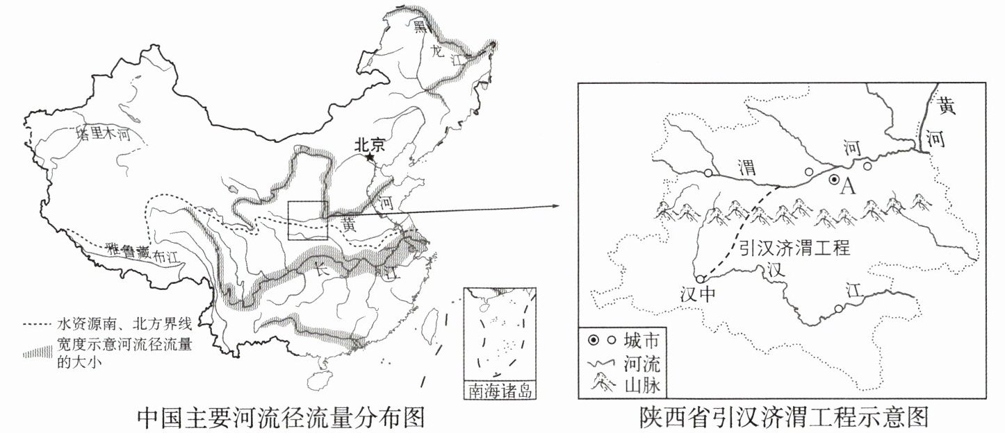 9. 一个国家河流径流量的大小,大体可以表明这个国家水资源的多少。下图为中国主要河流径流量分布图及陕西省引汉济渭工程示意图。引汉济渭是指将汉江水调往渭河。读图回答下列问题。