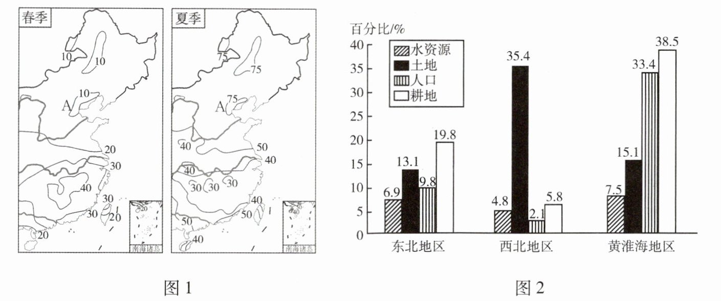 图1为中国东部地区春季、夏季降水量占全年降水量百分比等值线分布图,图2为中国北部地区水资源、土地、人口及耕地占全国总量百分比图。