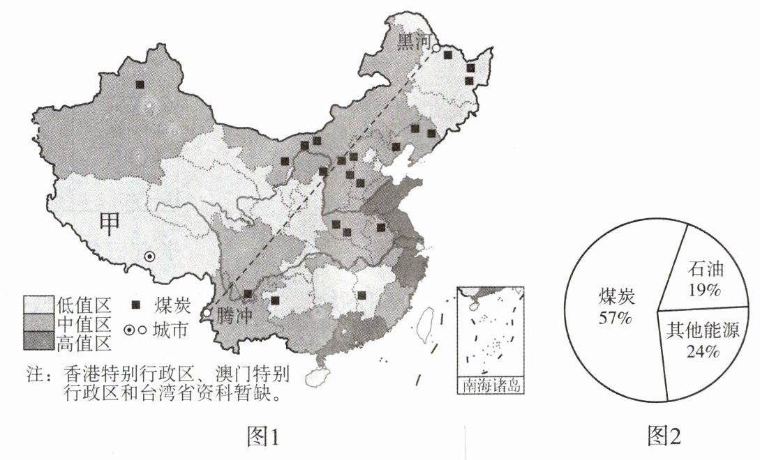12. 为实现“2030 年前实现碳达峰、2060 年前实现碳中和”的目标,习近平总书记提出,中国将严控煤电项目,“十四五”时期严控煤炭消费增长、“十五五”时期逐步减少。我国是世界第一煤炭消费大国,也是世界第一产煤大国。图 1 为中国用电量及主要煤炭分布图,图 2 为我国能源消费结构示意图。读图,回答下列问题。