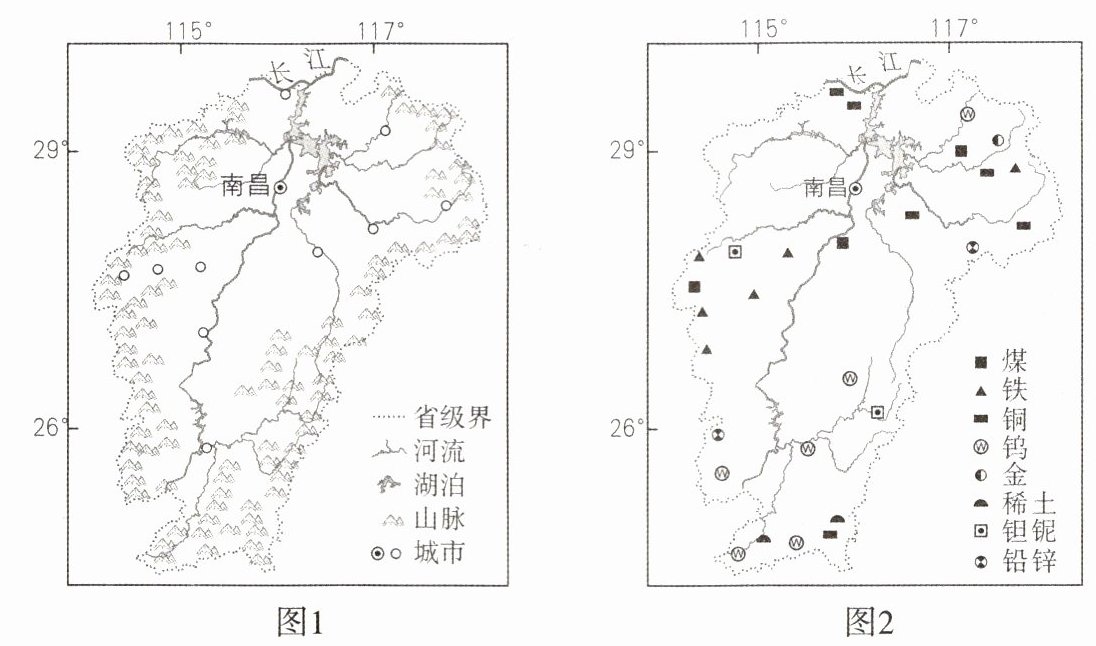 江西省的铜、钨、稀土、铀、钽、金、银素有“七朵金花”之称,其钨矿和离子型稀土矿在世界矿业领域具有重大影响,全球每年 70%的中重稀土、60%的黑钨都产自江西赣州,其素有“世界钨都”“稀土王国”的美誉。图 1 为江西省地形图,图 2 为江西省矿产资源分布图。