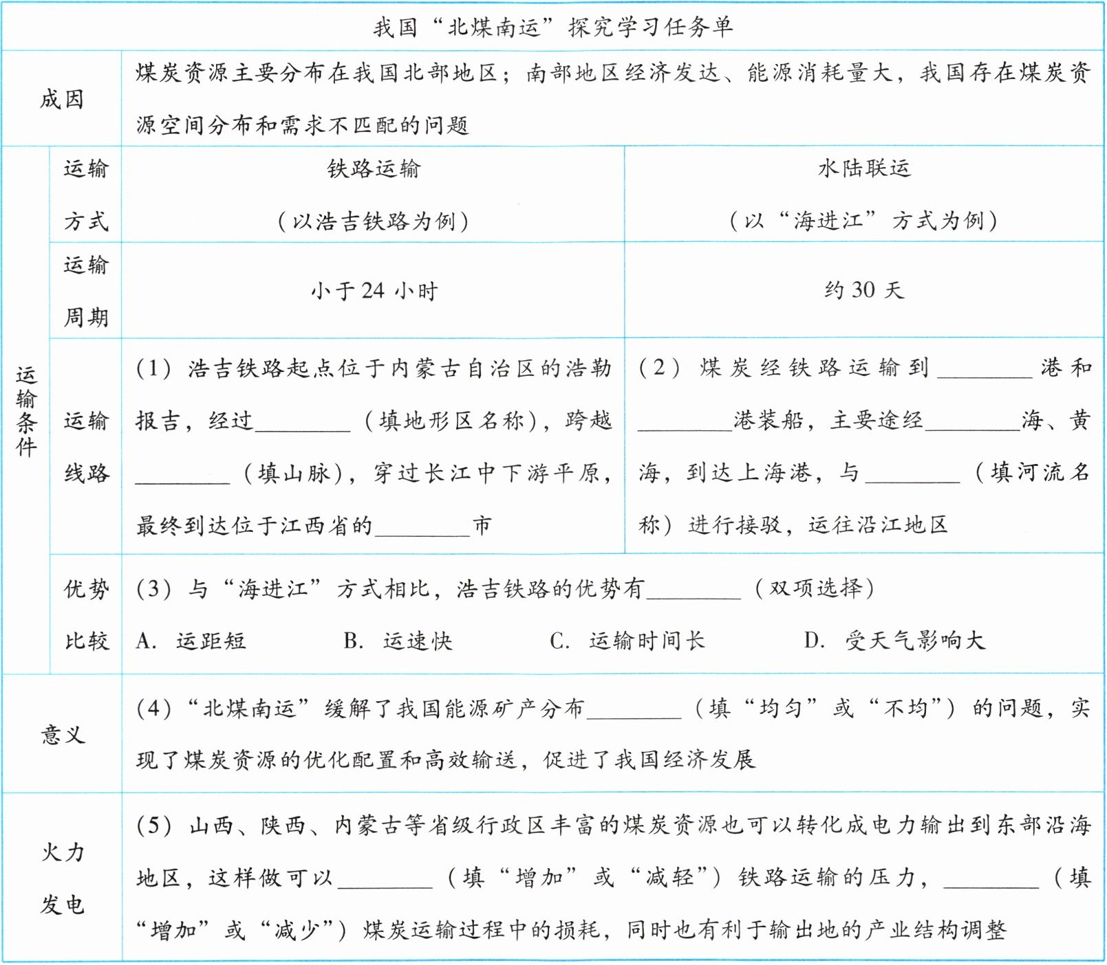 14. 我国煤炭资源的分布和需求存在空间上的差异。实施煤炭资源的跨区域调配有助于我国不同区域经济社会协调发展。同学们对我国“北煤南运”进行了探究学习。读图,完成探究学习任务单。