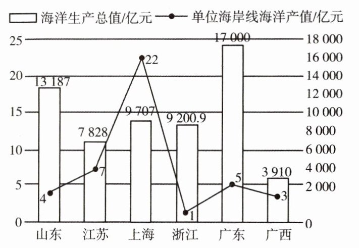 建设海洋强国是中国特色社会主义事业的重要组成部分,以海洋产业为代表的蓝色经济正在成为拉动中国经济增长的新引擎。右图示意 2020 年部分沿海省区海洋生产总值及单位海岸线海洋产值。读图完成 3~5 题。