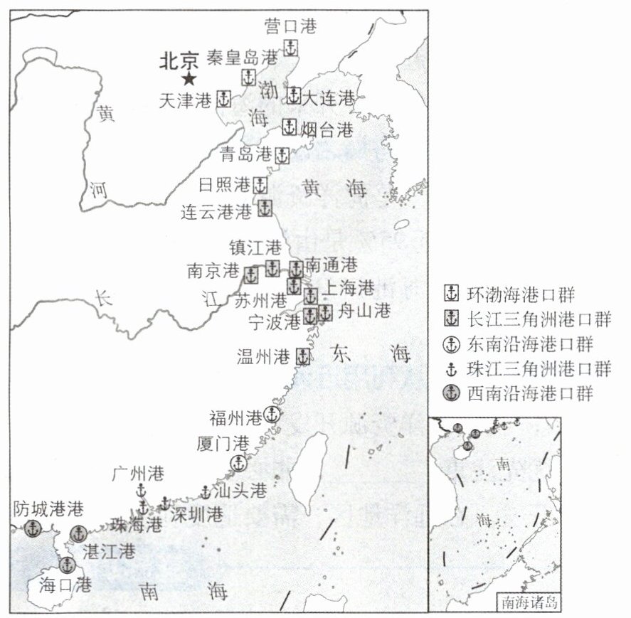 中国是一个海洋大国,海域辽阔,海岸线绵长。建设海洋强国是实现中华民族伟大复兴的重大战略任务。右图为中国沿海地区港口群示意图,读图完成 6、7 题。