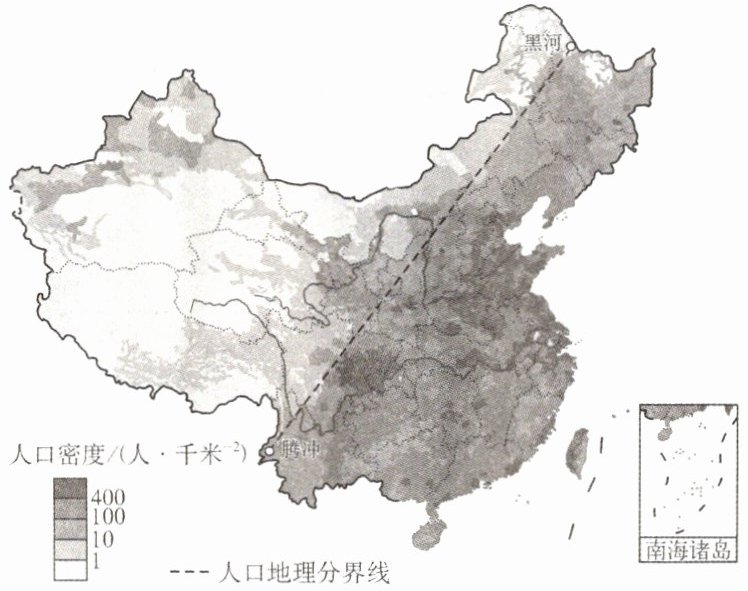 (1)读图可知,我国人口地区分布不均,人口地理分界线是