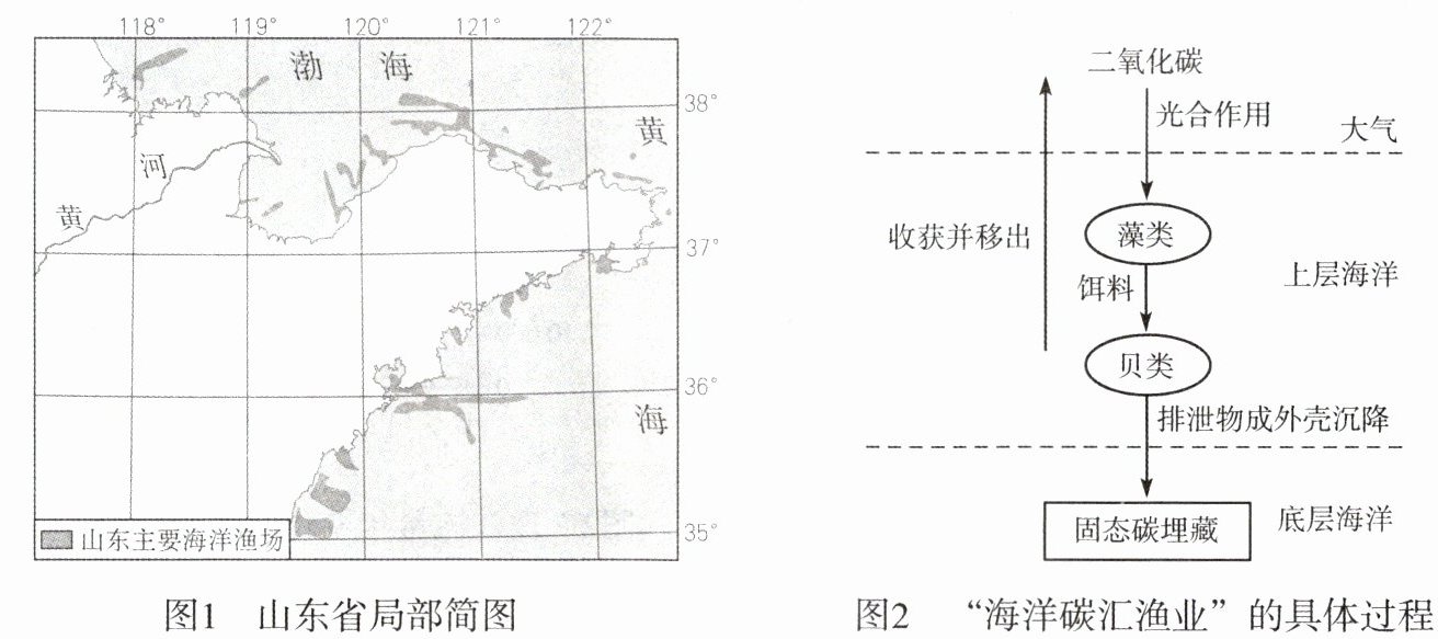“海洋碳汇渔业”是海洋渔业发展的新方向,指在海洋中养殖海藻,吸收大气中的二氧化碳,然后再通过海藻养殖贝类,从而实现将气态的二氧化碳转换为贝类外壳等固态有机碳,埋藏于海底。图 1 为山东省局部简图,图 2 为“海洋碳汇渔业”的具体过程示意图。