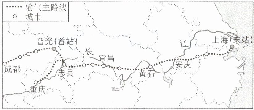 (2024·江苏盐城)川气东送一期工程西起四川普光,东至上海,是我国继西气东输工程后又一项天然气远距离管网输送工程。下图为川气东送工程线路示意图,读图完成 7、8 题。
