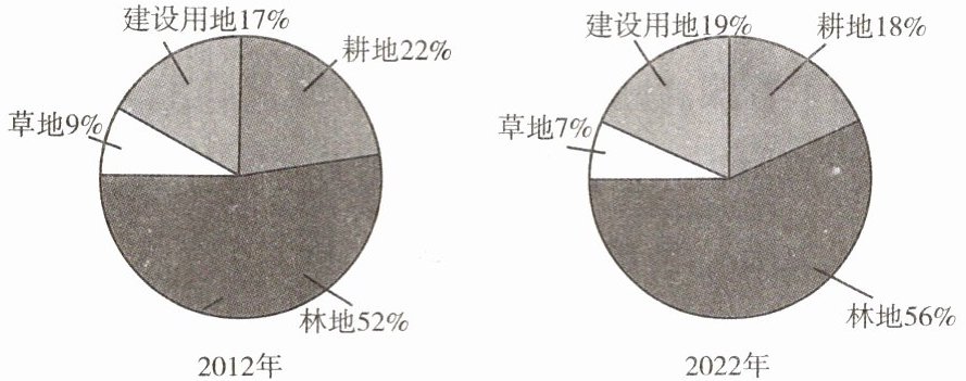 下图为某地区2012年和2022年的土地利用类型统计图。读图完成3、4题。