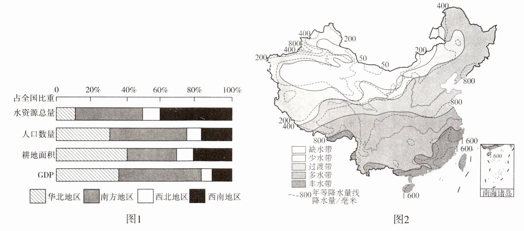 16. 我国水资源和土地资源分布不均衡。图1为我国四个地区水资源、人口、耕地、GDP比重示意图,图2为中国水资源空间分布示意图。读图回答下列问题。(7分)