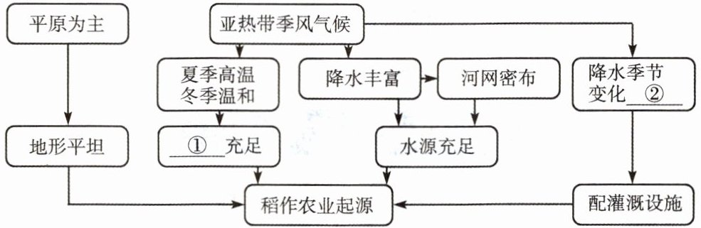 河网密布 → 降水季节变化 ② → 配灌溉设施