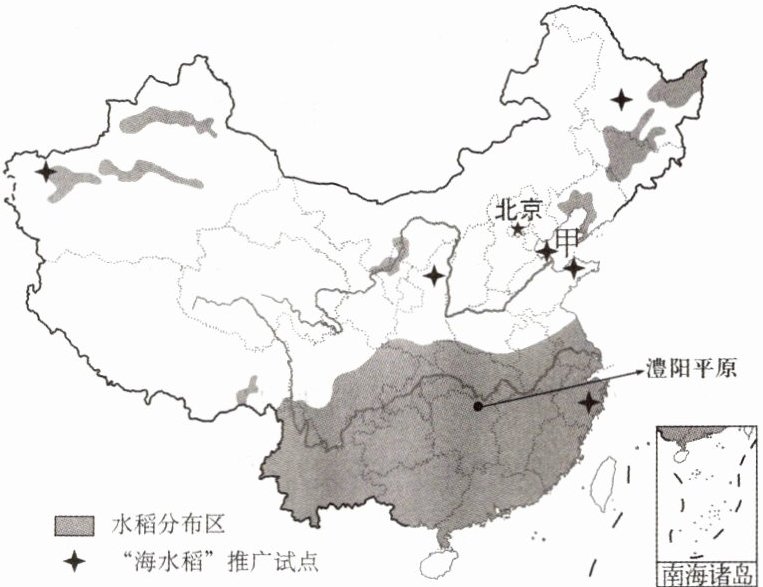 海水稻是可以生长在盐碱度0.3%到0.8%之间的水稻品种,能在普通水稻无法存活的贫瘠土地和高盐、高碱的土壤环境中生长。下图为中国水稻分布区和海水稻推广试点示意图。