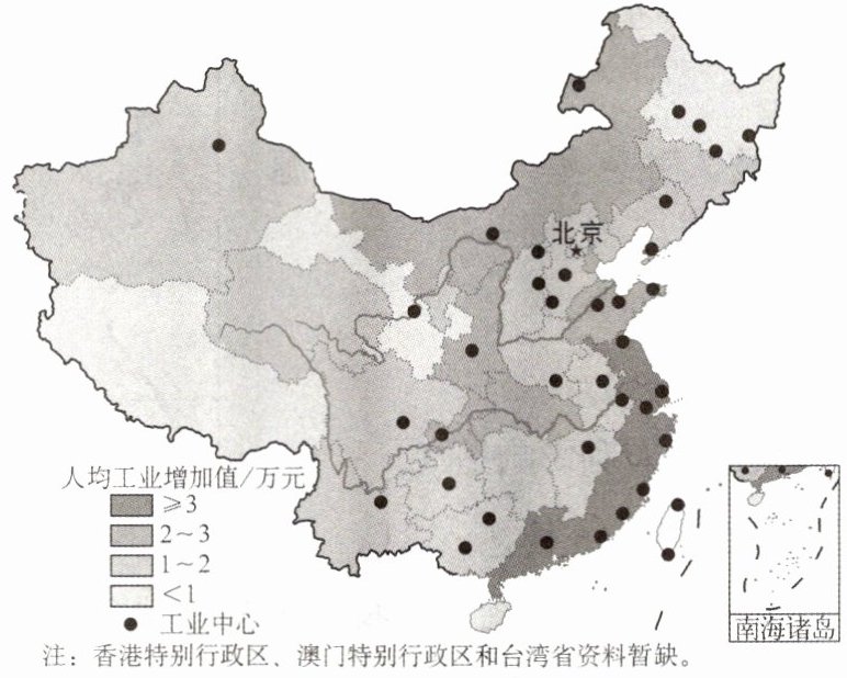 工业增加值是一段时间内工业企业生产过程中新增加的价值,计算方法为用工业企业生产活动的总成果减去生产过程中物质产品和劳务价值的损耗。下图示意某年中国各省级行政区人均工业增加值及主要工业中心分布,读图完成3、4题。