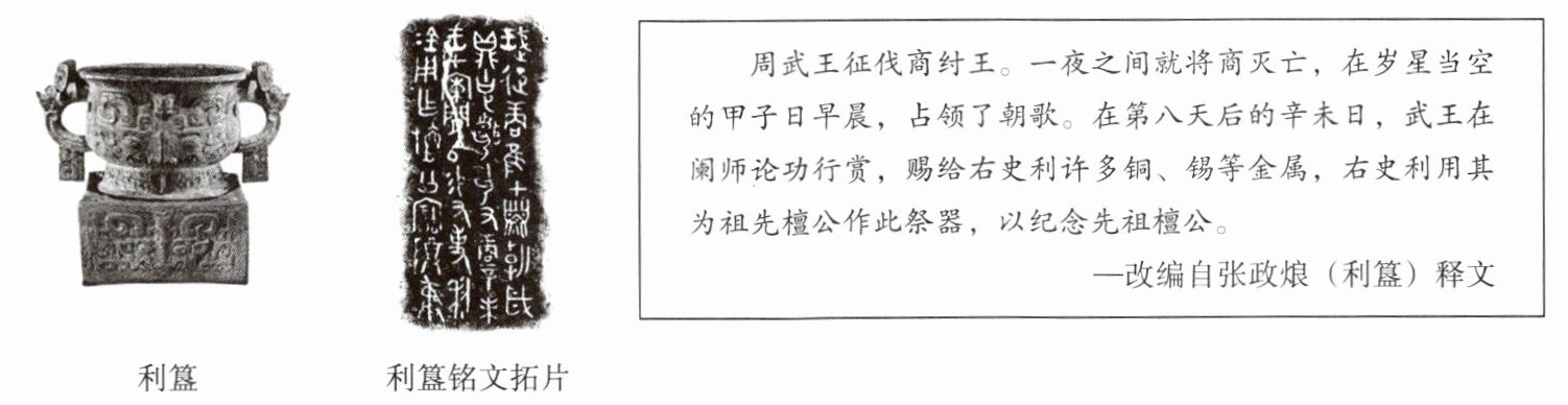 4. (2023·江苏徐州)关于商周更替的历史,最早仅在《尚书》《逸周书》等文献中有零星记载,可信度一直受到质疑,直到1976年在陕西省临潼县零口镇出土利簋,关于这方面的研究才取得重大突破。